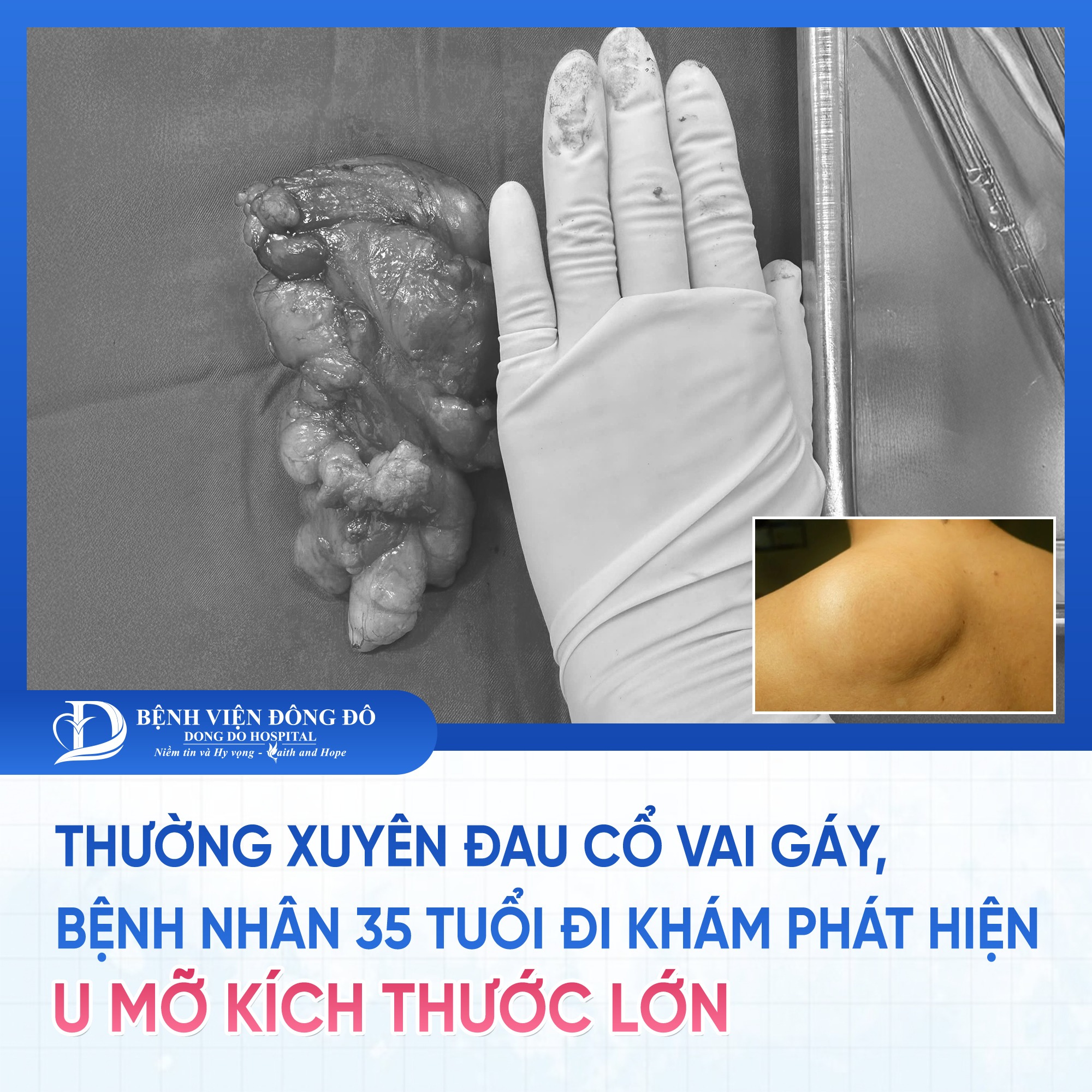 Chị T. quyết định đi khám sức khỏe định kỳ tại Bệnh viện Đông Đô để kiểm tra tình trạng trên. Sau khi thăm khám, chị T. được chẩn đoán có một khối u mỡ kích thước lớn 10x6cm nằm sâu dưới da vùng vai trái. Đây là khối u đã âm thầm phát triển trong nhiều năm qua.